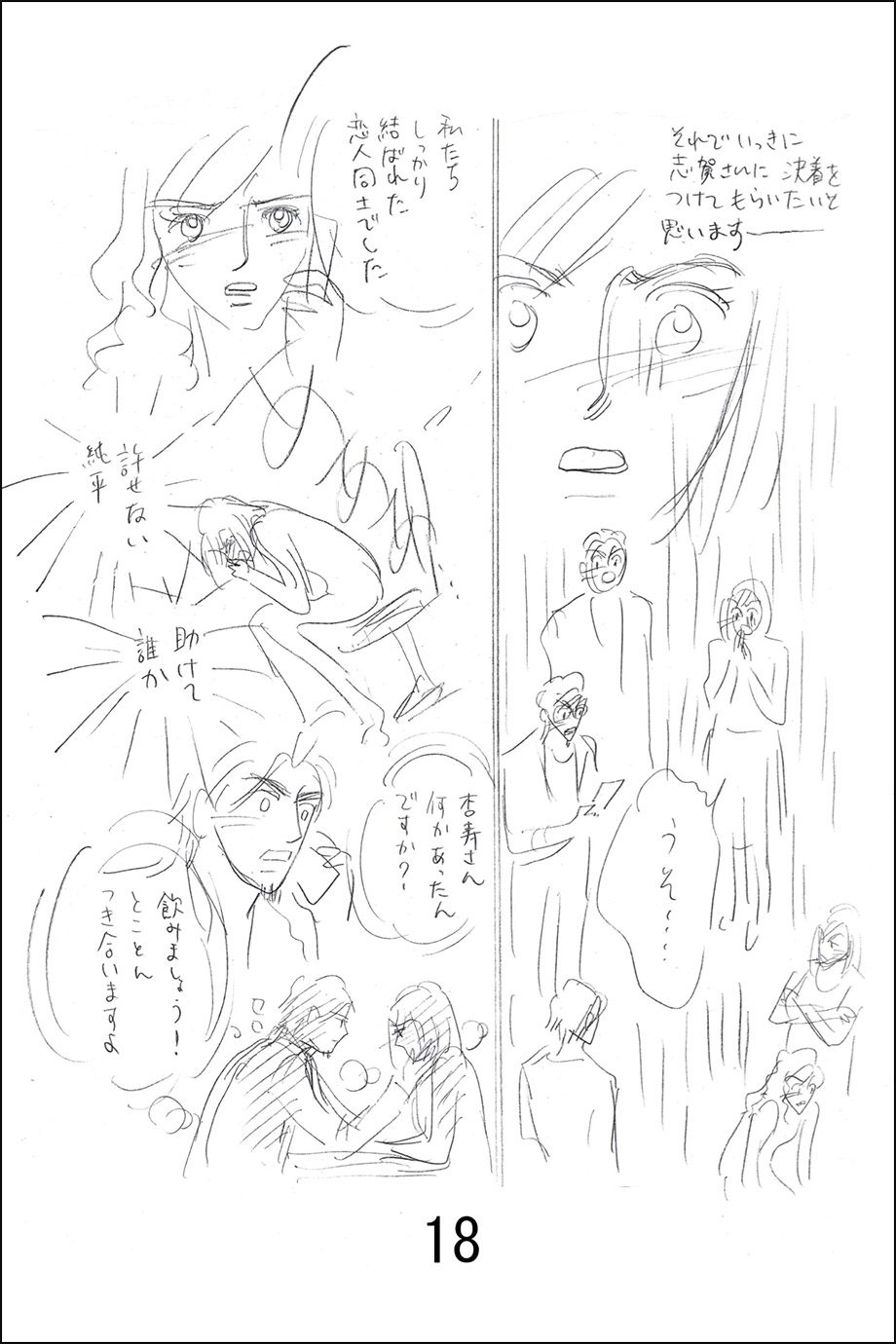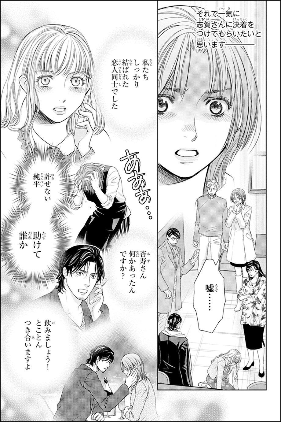 たくさんありますが、いかに読者が主人公になりきって読んでくれるか、衝撃や驚きを主人公とともに受けてくれるかを意識して描いてるので、最初に渡が杏寿に純平の浮気を暴露するシーンなどは流れや見せ方を工夫しました。